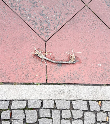Der Waldboden ist an vielen Stellen aufgegraben, sieht nach Wildschweinen aus. Ich bin ganz froh, dass ich keinem begegne. Es liegen entwurzelte Bäume kreuz und quer, die noch nicht einmal abgeschäffzgert sind... (bitte hier sich ein, zwei empörte Absätze vorstellen). Ich schaue bei den Plätzen vorbei, wo ich ansonsten etwas gefunden habe, aber da ist nichts. Ein paar Spechte klopfen lustlos herum.